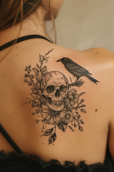 Skull and Raven Tattoo: Dark Elegance with a Touch of Nature