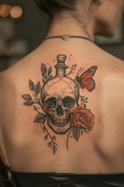 What I think makes this tattoo really stand out is its symbolism. You ve got the skull representing mortality, but then there s this butterfly, all about transformation and rebirth, alongside the rose symbolizing beauty and love. It s like a whole story in one tattoo! Plus, the potion bottle just adds that extra layer of intrigue like, what s the magic behind all this? This one s perfect for anyone who loves tattoos with deep meaning and a little mystery.