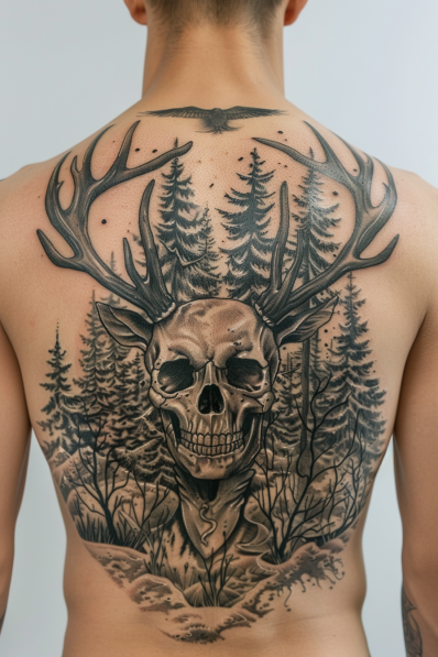 This impressive tattoo features a large deer skull with massive antlers set against the backdrop of a dense, dark forest. The towering trees stretch across the entire back, framing the skull in a way that gives it a wild and almost mystical vibe. The skull itself is beautifully detailed with shading that creates a realistic texture, while the antlers extend upward, blending with the natural scene behind it. A raven perched above adds another layer of symbolism, hinting at mystery and wisdom.