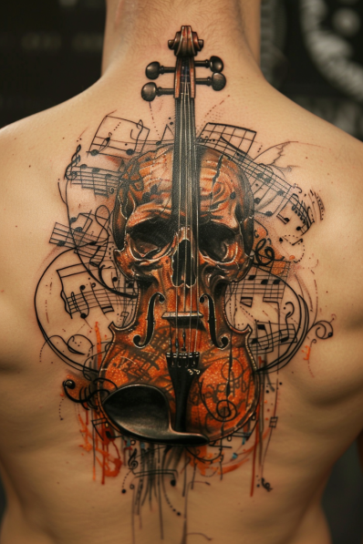 This stunning tattoo blends the elegance of a violin with the haunting presence of a skull. The violin s body seamlessly transforms into the skull, with musical notes swirling around in an artistic and dynamic composition. The rich, dark orange tones of the violin contrast beautifully with the deep shadows of the skull, while the musical notes seem to dance around the instrument, adding movement and life to the piece. The overall design has a strong sense of flow, drawing the eye from top to bottom in a mesmerizing visual symphony.