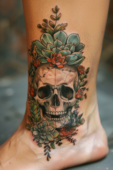 This tattoo artfully combines a skull with lush, vibrant succulents growing around and from it. The rich greens and oranges of the succulents create a lively contrast against the gray tones of the skull, making the plants look like they re thriving off the decay. The succulents are intricately detailed, with fleshy leaves and blossoms that give the piece a sense of renewal and growth. Placed near the ankle, this design wraps beautifully around the area, making it feel grounded and organic.