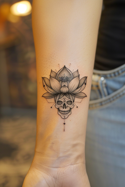 This tattoo elegantly combines a delicate lotus flower with a small, intricate skull nestled within its petals. The lotus, a symbol of purity and spiritual awakening, contrasts beautifully with the skull, representing mortality and the transient nature of life. The fine linework and dot shading create a soft, almost ethereal effect, making the design feel balanced and serene. The symmetry of the lotus petals draws the eye to the skull at the center, creating a harmonious blend of beauty and darkness.