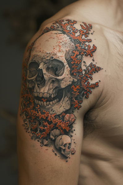 This tattoo combines a traditional skull with the unexpected addition of vibrant coral formations growing out of and around it. The coral s bright orange hue provides a stunning contrast to the gray and black tones of the skull, making it appear as though life is emerging from death. The intricate detailing of the coral branches adds texture and depth, giving the piece a surreal, otherworldly feel. Smaller skulls and coral fragments at the base of the design create an intriguing sense of layering and continuation.