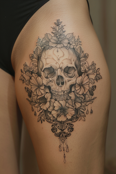 Ornate Skull and Floral Tattoo: Elegance with an Edge