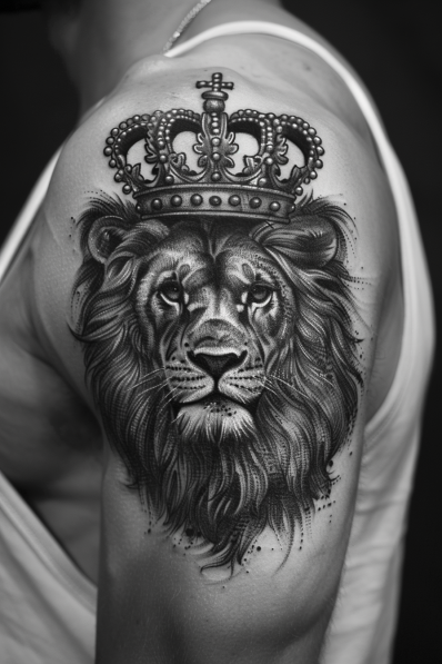This striking shoulder tattoo features a detailed lion s head crowned with an ornate, royal crown. The lion s mane is depicted with fine lines, giving it a realistic and powerful presence. The crown adds a regal touch, symbolizing strength, leadership, and authority. The black and gray shading gives the tattoo depth and texture, making the lion s gaze feel intense and captivating.