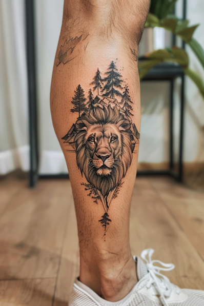 This calf tattoo showcases a majestic lion s head framed by a serene forest landscape. The lion s mane seamlessly blends into the towering trees, creating a unique connection between the animal and its natural surroundings. The detailed line work captures the texture of both the lion s fur and the pine trees, adding depth and dimension to the design. The placement on the calf is ideal, allowing the tattoo to follow the natural curve of the leg, making it a stunning piece from any angle.