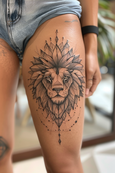 This thigh tattoo features a stunning geometric lion design. The lion s face is composed of intricate lines and shapes, giving it a modern, abstract feel. Surrounding the lion are symmetrical patterns that extend outward, almost like a mandala, adding depth and dimension to the piece. The design is clean and sharp, with a focus on balance and symmetry, making the lion appear both powerful and harmonious.