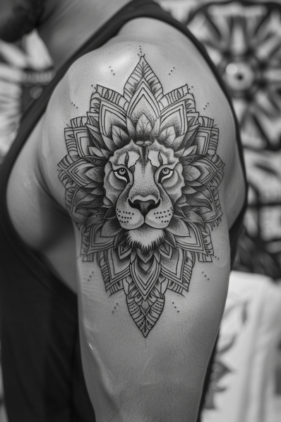 This striking tattoo combines the majestic face of a lion with intricate geometric patterns radiating outward like a mandala. The lion s face is rendered in a realistic style, capturing its fierce yet noble expression, while the surrounding patterns create a sense of symmetry and balance. The placement on the shoulder enhances the tattoo s impact, making it a prominent and eye-catching piece.