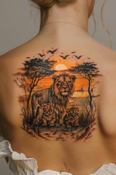 I find this tattoo to be both powerful and heartwarming. The realism brings the scene to life, making it feel like you re witnessing a tender moment in the wild. The way the sunset illuminates the lioness and her cubs adds a layer of depth and emotion to the design, highlighting the bond between them. This piece is not just a tattoo; it s a vivid reminder of the strength and beauty of maternal love in the animal kingdom.