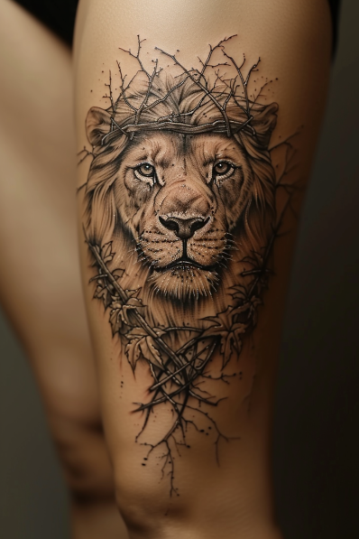 I ve got to say, this tattoo is absolutely stunning. The combination of the fierce lion and the crown of thorns is powerful like it s telling a story of strength and sacrifice all in one. I love how the artist used the branches to frame the lion, giving it a wild, untamed look. If you re into tattoos with deep meaning and impeccable artistry, this one definitely deserves a top spot on your list. Plus, it s just plain cool to look at!
