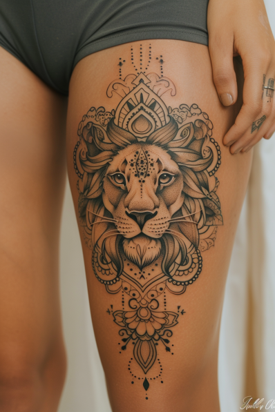 Feminine Lion Thigh Tattoo with Intricate Patterns