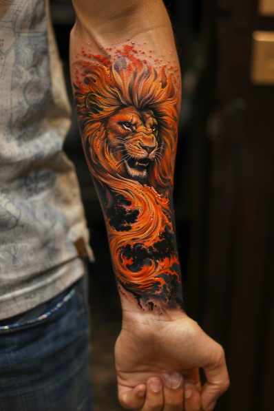 I think this tattoo is awesome because it s not just a simple lion design it tells a story of strength breaking through barriers. The forearm placement is perfect for this style, as it allows the tattoo to be a constant reminder of resilience and power. It s a bold choice that makes a strong statement without needing to be overly complex.
