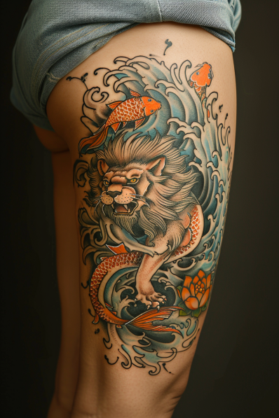 This thigh tattoo is a brilliant fusion of Japanese artistry and powerful symbolism. The design features a majestic lion emerging from swirling water, with the lower part of its body transforming into a vibrant koi fish. The rich colors and detailed line work highlight the lion s fierce expression, while the koi fish tail adds a dynamic flow to the composition. A lotus flower delicately placed within the water further enhances the balance between power and tranquility in this piece.