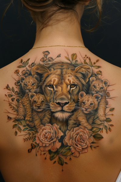 This stunning back tattoo features a lioness surrounded by her cubs, beautifully framed by delicate roses and foliage. The lioness is at the center, exuding a calm yet protective aura, while the cubs, with their playful expressions, are nestled around her. The detailed shading brings the animals to life, making it feel as if they re ready to leap off the skin. The soft, natural colors used for the flowers add a gentle contrast, balancing the power of the lioness with the beauty of the flora.