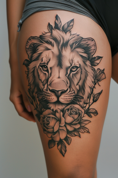 This tattoo showcases a powerful lion s face framed by beautifully detailed roses, positioned on the thigh. The bold line work captures the lion s fierce expression, while the roses add a touch of softness, creating a striking contrast. The shading brings depth to the design, making the lion appear almost three-dimensional, with the roses delicately intertwining around the majestic face.