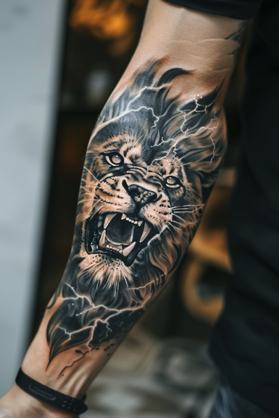 This intense tattoo captures a roaring lion, with its fierce expression enhanced by striking bolts of lightning that crackle across the forearm. The design blends realism with dynamic energy, as the lion s mane seems to merge with the storm, creating a powerful visual effect. The details in the lion s face are sharp, making the eyes and teeth stand out, while the lightning adds a dramatic and electrifying touch to the overall composition.