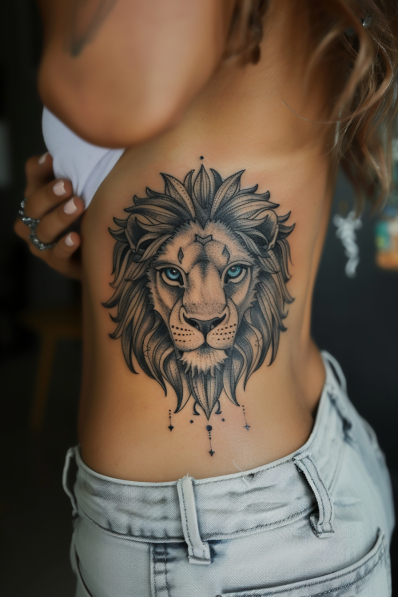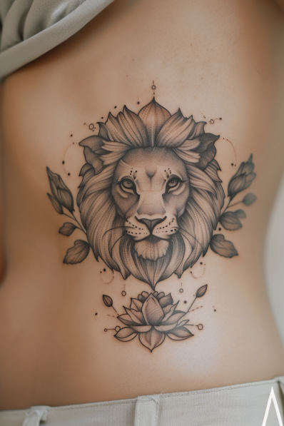 This tattoo features a majestic lion s face intertwined with a blooming lotus flower, delicately placed on the rib cage. The design is both powerful and feminine, with the lion symbolizing strength and courage, while the lotus represents purity and spiritual growth. The soft shading and intricate line work add a touch of elegance, making it a perfect choice for those looking to combine beauty with symbolism.
