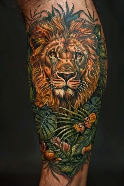 What makes this tattoo stand out is its use of color and detail. The artist has captured the wild essence of the lion, making it feel almost like it s watching you from the depths of the jungle. The combination of the fierce lion with delicate butterflies and detailed foliage creates a balanced piece that s both bold and beautiful. If you re looking to make a statement with a nature-inspired calf tattoo, this one is sure to impress.