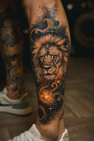 This calf tattoo is a cosmic masterpiece. It features a powerful lion s face surrounded by swirling galaxies and celestial elements, creating an otherworldly aura. The lion s mane seems to blend seamlessly into the starry background, with hints of glowing orange and yellow, making it look like the lion is emerging from the very fabric of the universe. The intricate details of the galaxies, combined with the majestic expression of the lion, give this tattoo a mystical and awe-inspiring vibe.