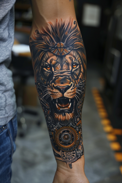 This forearm tattoo blends the fierce spirit of a lion with the precision of mechanical elements. The lion s face is front and center, roaring with intensity, while its mane is interwoven with gears, cogs, and metallic details that give it a steampunk vibe. The sharp contrast between the organic and mechanical elements makes this design unique and visually striking, with the metallic sheen adding an extra layer of depth.