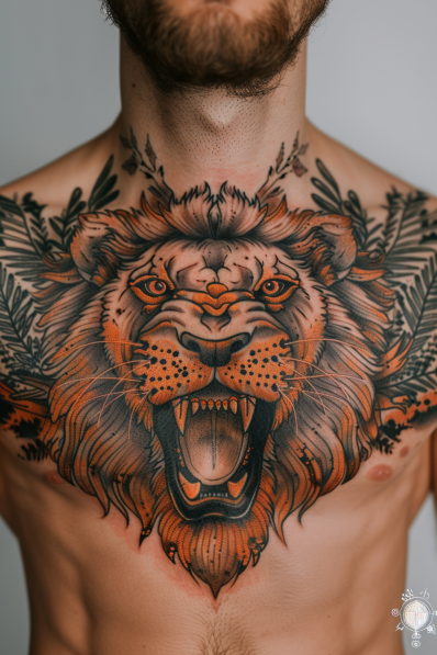 This roaring lion chest tattoo is nothing short of fierce. Spanning across the entire chest, the lion s powerful expression is captured in vibrant oranges and blacks, with its mouth wide open, revealing sharp teeth. The mane flows outward, blending seamlessly with the intricate leaf designs that frame the lion s face, giving the tattoo an almost regal appearance. The intensity in the lion s eyes is what draws you in, making it hard to look away.
