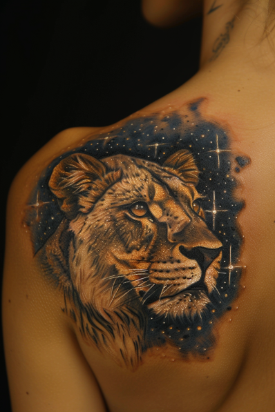 I ve got to say, this tattoo is simply gorgeous. The way the lioness is framed by the starry night makes it feel like she s watching over the world with a quiet strength. It s the perfect mix of fierce and feminine, showing that power doesn t always have to be loud. The starry sky adds a touch of magic to the whole piece, making it feel almost like a scene out of a beautiful dream. If you re looking for a tattoo that s both stunning and meaningful, this one s definitely a winner. It s like having a piece of the night sky right there on your shoulder!