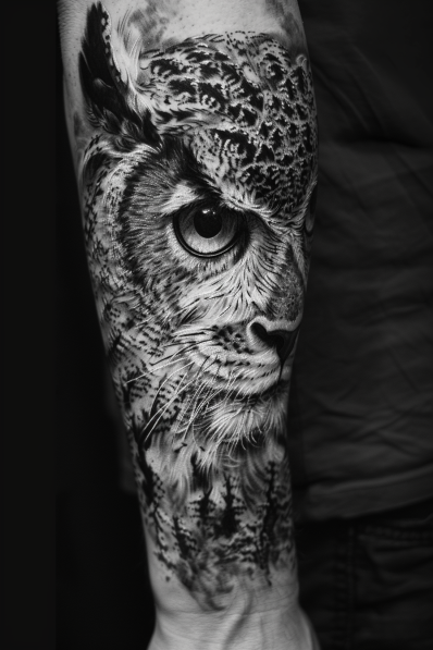 This tattoo merges the powerful imagery of a lion and an owl in a dark art style, making it an intense and captivating piece for the forearm. The lion s fierce gaze is paired with the wisdom of the owl, both animals intricately designed with deep, dark shading that gives the tattoo a mysterious and edgy vibe. The detailed feathers of the owl and the lion s mane blend together seamlessly, creating a cohesive and powerful image.