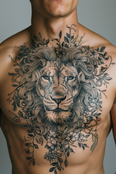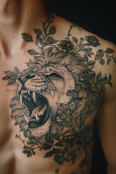 This powerful chest tattoo features a roaring lion intricately entwined with delicate flowers and vines. The lion s fierce expression, with its sharp teeth and intense eyes, is perfectly balanced by the soft, detailed floral elements that seem to grow naturally around it. The placement on the chest allows the lion s majestic mane to spread across the skin, giving the tattoo a sense of movement and life.
