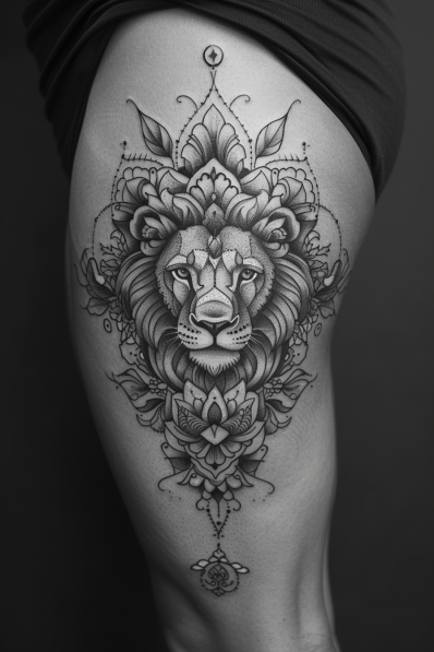 This stunning black and gray thigh tattoo features a regal lion s face surrounded by intricate ornamental designs. The lion is depicted with a calm yet intense expression, while the surrounding patterns give the piece a mystical, almost mandala-like vibe. The symmetry in the design draws the eye, making the lion s face the central focus amidst the beautifully detailed flourishes.