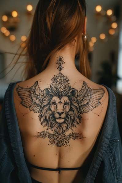 I think this tattoo is an absolute showstopper. The placement on the upper back is perfect for the wings, letting them span out naturally and making the lion s face the focal point. The combination of the lion with wings adds a mythical vibe, as if this lion is some kind of guardian or protector. It s powerful and elegant at the same time a design that s sure to turn heads. Plus, it s the kind of tattoo that s just as impressive up close as it is from a distance.