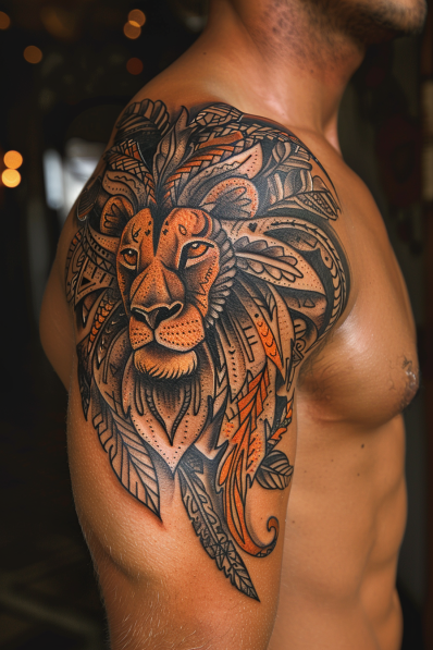 This lion tattoo blends the king of the jungle with tribal design elements, creating a piece that s both majestic and artistic. The lion s face is centered on the shoulder, with its mane flowing outwards in a mix of bold black lines and intricate patterns. The use of subtle orange highlights adds depth, making the mane look almost like flames dancing around the lion s head. The design wraps perfectly around the shoulder, giving it a dynamic and powerful appearance.