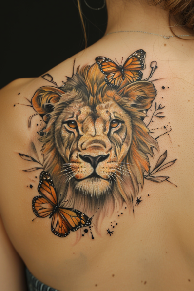 I love how this tattoo combines the ferocity of a lion with the gentle elegance of butterflies. It s like wearing your inner strength on your sleeve or in this case, your back but with a touch of grace. The contrast between the bold lion and the delicate butterflies makes this piece both powerful and peaceful, which is something you don t see every day. It s a great choice if you re looking to represent both sides of your personality: the fierce and the gentle.