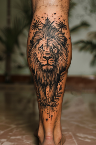 I really like how this tattoo uses the entire calf to tell a story. The lion looks like it s ready to leap out at any moment, which adds a sense of movement and vitality to the piece. The jungle elements also give the tattoo a unique twist, turning a classic lion design into something more adventurous and wild. If you re into bold, nature-inspired tattoos, this one hits the mark perfectly.
