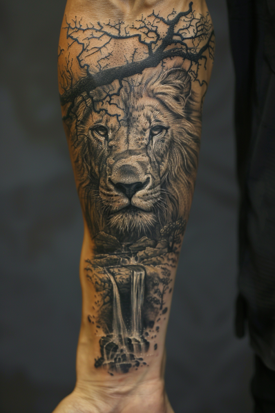 This forearm tattoo is a visual masterpiece that combines the power of nature with the majesty of a lion. The lion s face is front and center, with a calm yet intense gaze that commands attention. Above the lion, delicate tree branches stretch across, adding a touch of elegance and a hint of mystery. Beneath the lion, a cascading waterfall flows down the arm, creating a dynamic contrast between the strength of the lion and the serene beauty of the natural world. The use of shading is spot-on, giving the tattoo depth and a lifelike quality that s hard to ignore.