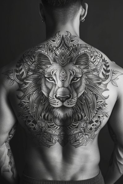 This tattoo is seriously cool because it combines the raw power of a lion with the precision of geometric art. The way the patterns flow and merge into the lion s mane creates a visually stunning effect that s both bold and sophisticated. Plus, covering the entire back makes this piece a real statement it s perfect for someone looking to showcase their strength and style.