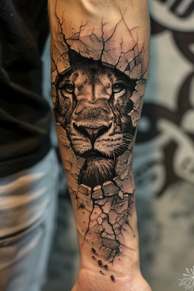 This tattoo captures the intense gaze of a lion, seemingly breaking through cracked stone on the forearm. The realistic detailing of the lion s face makes it appear as though the powerful creature is emerging from within, surrounded by fragmented stone. The contrast between the smooth, lifelike fur and the rough, jagged edges of the cracked surface gives the design a dynamic and almost 3D effect.