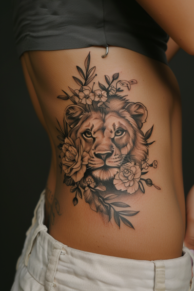 I have to say, this tattoo is a perfect example of balance. It s both powerful and graceful, capturing the strength of the lion and the beauty of nature in one cohesive design. The ribcage placement is a bold choice but adds to the overall impact, making it a piece that s as meaningful as it is beautiful. If you re looking for something that speaks to both your inner warrior and your love for delicate details, this design is a winner.