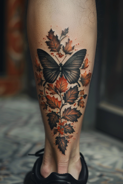 This striking tattoo combines the elegance of a black butterfly with the warm tones of autumn leaves. The butterfly, positioned at the center of the design, features smooth black shading, creating a strong contrast with the vivid orange and brown leaves that cascade down the calf. The realistic leaves, scattered with small dots and subtle splashes of color, give the tattoo a seasonal, nature-inspired vibe. The placement on the calf makes this design dynamic, following the natural curve of the leg.