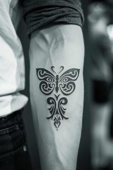 Honestly, this one is badass! I love how it manages to be so bold without being overcomplicated. The tribal elements give it a timeless vibe, and the placement on the forearm makes it the perfect statement piece. If you re a fan of tattoos that are both artistic and strong, this one ticks all the boxes. Plus, the symmetry in the design is so satisfying to look at! It s sleek, stylish, and definitely not your average butterfly tattoo.