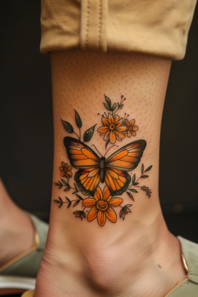 This bright and cheerful ankle tattoo features a beautiful orange butterfly, framed by delicate orange flowers and green leaves. The design pops with vibrant colors, and the shading on the butterfly s wings gives it a sense of movement, as if it s about to take flight. The surrounding flowers add a playful, nature-inspired vibe, complementing the butterfly s warm tones. Placed just above the ankle, this tattoo is both eye-catching and subtle, making it perfect for those who love something that s noticeable but not too over-the-top.
