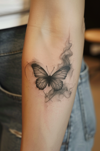 This delicate and ethereal arm tattoo features a finely detailed black butterfly surrounded by soft, smoky shading. The butterfly s wings are lightly shaded with gentle gradients, making it appear as though it s floating gracefully above the skin. The surrounding smoky effect adds a sense of movement and mystery, giving the tattoo a dreamlike quality. The overall minimalism of the design enhances its elegance, making it a subtle yet striking piece.
