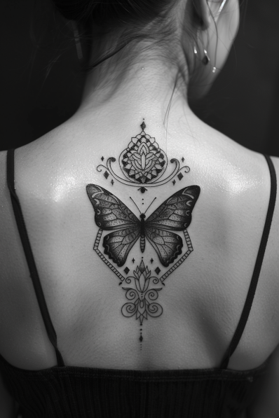 This intricate back tattoo features a beautifully detailed butterfly at its center, framed by geometric shapes and ornamental flourishes. The butterfly s wings are delicately shaded, creating a soft contrast to the sharp, clean lines of the geometric designs. Above and below the butterfly, ornamental elements add a decorative flair, resembling mandalas or lotus-like patterns. The vertical flow of the tattoo makes it a stunning centerpiece for the upper back, balancing elegance with a bit of an edge.