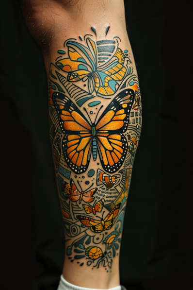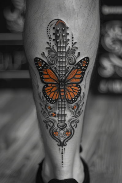 This striking calf tattoo combines the grace of a monarch butterfly with the boldness of a guitar. The butterfly s vibrant orange wings sit prominently at the center of the design, with its body blending seamlessly into the neck and strings of the guitar. Surrounding the butterfly are elegant ornamental patterns, adding a touch of sophistication and artistic flair. The black and grey shading gives the tattoo depth, while the pops of orange in the butterfly and small details bring the design to life.
