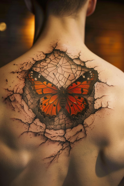 This jaw-dropping back tattoo features a vibrant orange butterfly emerging from a cracked, shattered glass effect. The bold, fiery colors of the butterfly contrast sharply against the dark cracks, giving the impression that the butterfly is breaking through the skin or emerging from another world. The detail in the cracks adds depth and texture, while the butterfly s bright orange wings create a striking focal point. Positioned on the upper back, this design has a dynamic and powerful feel that can t be missed.