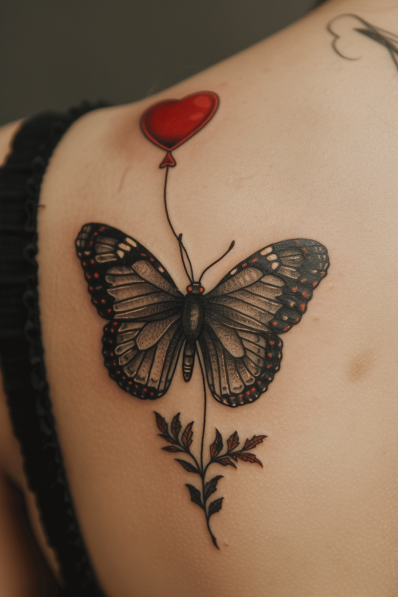 This charming tattoo features a detailed black and grey butterfly gently holding onto a string attached to a bright red heart-shaped balloon. The butterfly s wings are delicately shaded, with subtle pops of red on the wing tips, which match the vibrant heart balloon floating above. A small leafy branch adds a touch of nature to the design, balancing out the whimsical feel of the balloon. The soft shading and minimalist lines create an overall sense of grace and lightness, while the balloon adds a fun, romantic twist.