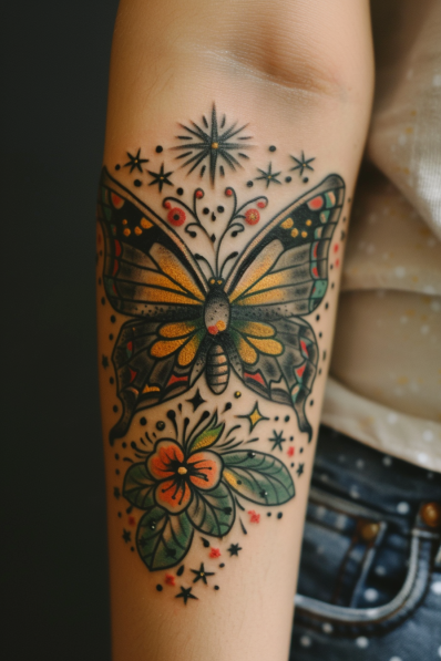 This vibrant tattoo showcases a bold butterfly paired with a beautifully detailed flower, all done in a classic traditional tattoo style. The butterfly s wings are filled with rich yellows, greens, and reds, framed by thick black outlines that give it a striking presence. Surrounding the butterfly and flower are decorative stars and dots, adding a touch of whimsy to the overall design. The traditional style really shines here, with saturated colors and a clean, timeless aesthetic. Placed on the forearm, it s a perfect canvas for showing off this classic design.
