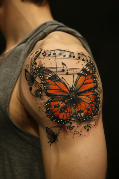 This stunning shoulder tattoo brings together the beauty of a vibrant orange butterfly and the flowing rhythm of music notes. The butterfly s wings, rich with shades of orange and black, take center stage, while musical notes and bars dance in the background, wrapping around the shoulder. The combination of the delicate butterfly and the whimsical music notes gives the tattoo a unique sense of harmony, as if the butterfly itself is floating along with the melody. Small details, like the scattered butterflies and ink splatters, add an artistic touch to the overall design.