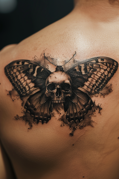 This striking tattoo merges the delicate wings of a butterfly with the fierce imagery of a skull at its center. The butterfly wings are detailed with intricate shading, creating a lifelike appearance, while the skull adds a dark, edgy twist to the overall design. The contrast between the soft, natural beauty of the butterfly and the hard, intense presence of the skull makes this piece incredibly unique and eye-catching. The placement on the upper back gives it room to stand out and allows for the detail to be fully appreciated.