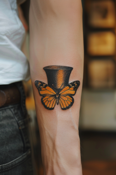 This unique and quirky tattoo features a monarch butterfly gracefully emerging from a classic black top hat. The butterfly s vibrant orange wings stand out beautifully against the dark shading of the top hat, creating a magical and whimsical contrast. The design s clean lines and bold colors give it a polished yet playful feel. Placed on the forearm, this tattoo draws the eye with its fun, unexpected combination of elements.