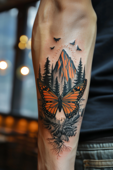This incredible forearm tattoo combines the beauty of a monarch butterfly with the majesty of nature. The butterfly, in bold orange and black, dominates the foreground, while a scenic backdrop of towering trees, jagged mountains, and birds flying overhead adds depth and narrative to the design. The way the landscape integrates into the butterfly s wings is both creative and visually stunning. The roots at the bottom of the design symbolize a deep connection to nature, grounding the tattoo and giving it an earthy, meaningful feel.